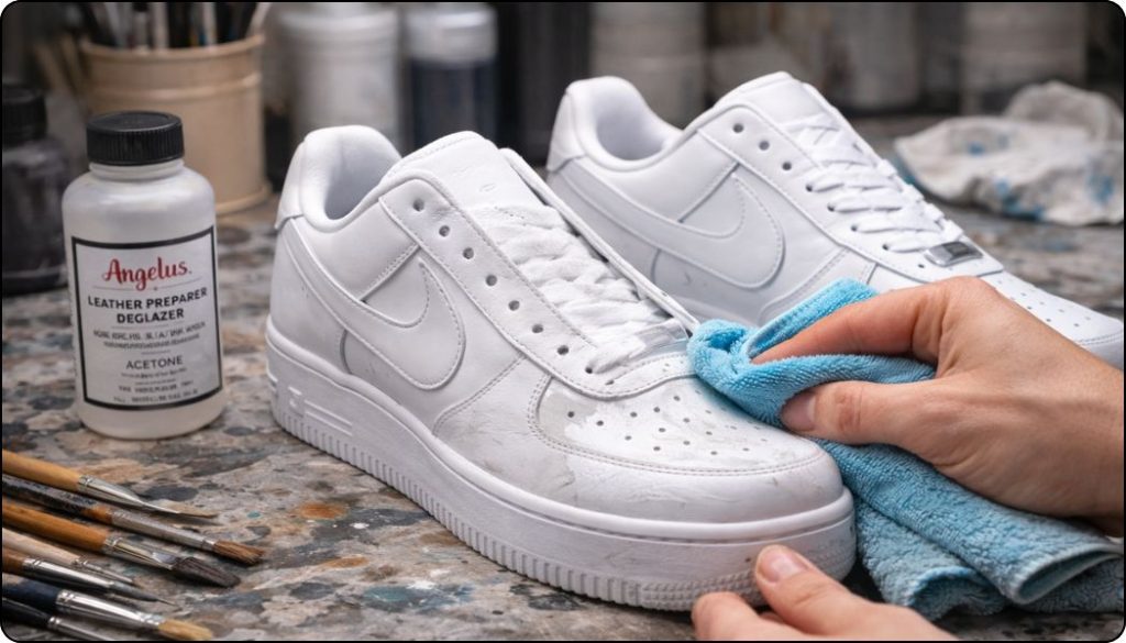 Ensuite, il faut dégraisser. C’est une étape souvent sous-estimée, mais essentielle. Même si la chaussure paraît propre, il reste souvent un film invisible. On utilise généralement de l’alcool ménager ou un produit spécifique. Sans dégraissage, la peinture adhère mal et finit par se décoller.