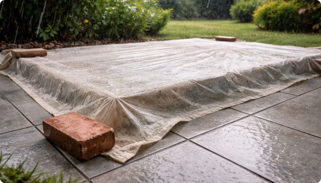 La première solution consiste à protéger la zone avec une bâche. Une protection simple peut empêcher l’eau de tomber directement sur les joints encore frais. L’idéal est d’installer la bâche de manière à laisser circuler l’air, afin d’éviter une accumulation d’humidité sous la protection.
